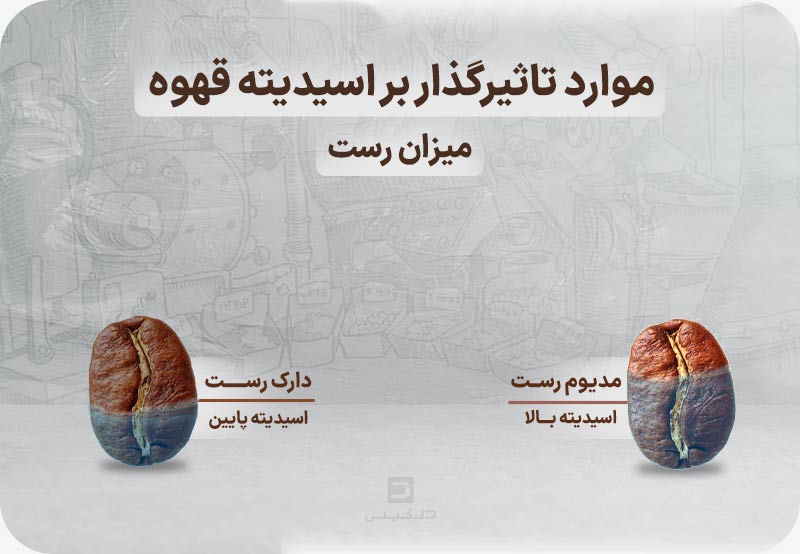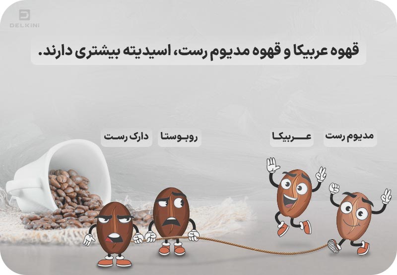 هر چقدر دانه های قهوه برشته تر شوند، اسیدیته قهوه نیز اثر خود را بیشتر از دست می دهند و در نتیجه طعم تیزی کمتری را خواهند داشت. بنابراین برای آنکه اسیدیته قهوه باقی بماند بهتر است نمونه هایی از قهوه هایی با روست متعادل تر مانند لایت و مدیوم را برای خرید قهوه انتخاب کنید.