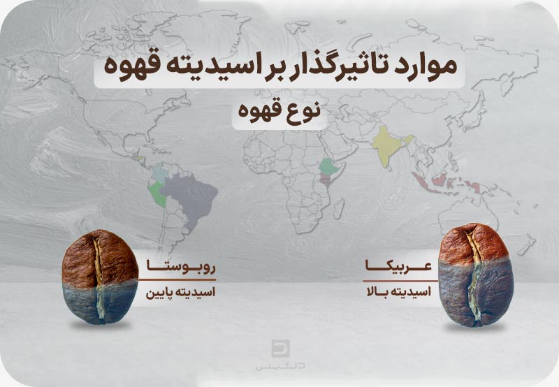 از مهم ترین عوامل موثر در اسیدیته قهوه است. بنابر نوع منطقه ای که قهوه در آن پرورش یافته است میزان اسیدیته در آن کاهش و یا افزایش می یابد. بذر قهوه عربیکا به این جهت که روند رشد آرام تری دارد و در مقابل قهوه روبوستا اسیدی تر بوده و با نوشیدن یک فنجان قهوه با اسیدیته و شیرینی بیشتری را تجربه خواهید کرد. (خرید قهوه عربیکا)