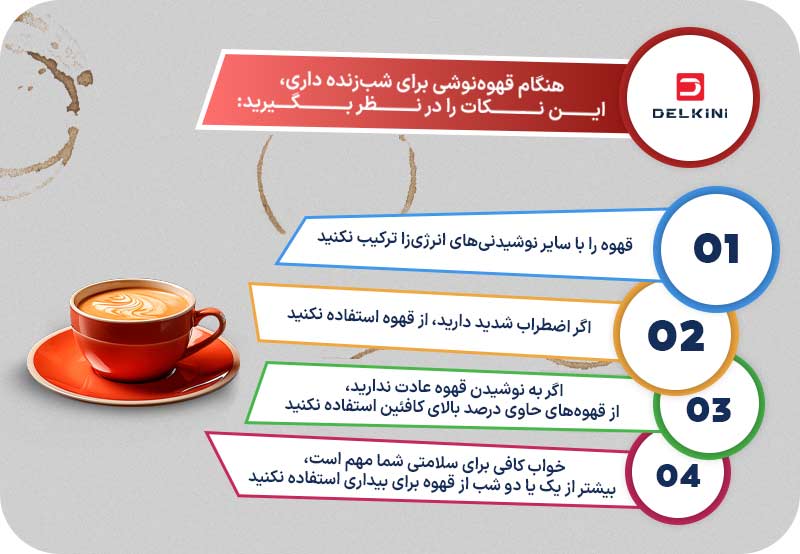 نوشیدن قهوه میتواند به شما در شب بیداری برای مطالعه و کار کمک بسیار زیادی کند؛ اما به یاد داشته باشید که نوع قهوه، زمان نوشیدن قهوه، میزان مصرف آن و سایر نکات این چنین، تأثیر بسیار زیادی بر روی تجربه شما از نوشیدن قهوه برای بیداری میگذارد. در صورتی که بعد از نوشیدن قهوه خوابآلود میشوید، به هیچ عنوان از شیر و شکر در قهوه خود استفاده نکنید و به سایر نکات مهم برای نوشیدن قهوه برای تمرکز هم دقت داشته باشید. حالا که میدانید چه ترکیب قهوهای برای شما مناسبتر است، میتوانید به فروشگاه دلکینی مراجعه کنید و از بین تنوع قابل توجهی از انواع قهوه، با توجه به ذائقه خود قهوه ایدهآلتان را تهیه کنید.