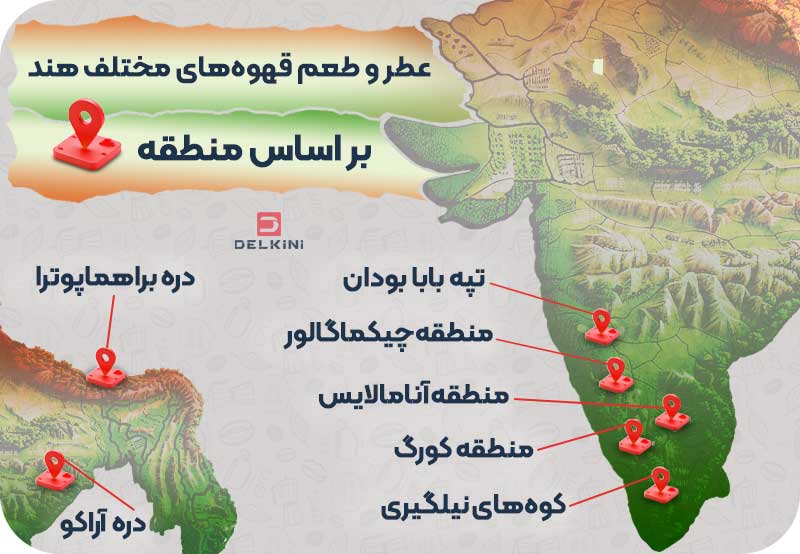کشور هند به خاطر شرایط جغرافیایی و اقلیمی متفاوت در نواحی مختلفش، قادر به تولید هر دو نوع قهوه، یعنی روبوستا و عربیکاست. (در مقاله تفاوت قهوه عربیکا و روبوستا، میتوانید از تفاوتهای آنها آگاه شوید.) از ارتفاعات کارناتاکا گرفته تا درههای شمال شرق هند، هر کدام مکانی مناسب برای کشت این دو نوع قهوه به حساب میآیند. مشخصات و ویژگیهای قهوه هند در هر منطقه به خاطر شرایط آب و هوایی، متفاوت است. در ادامه با عطر و طعم قهوه هند در مناطق مختلف آشنا میشوید: