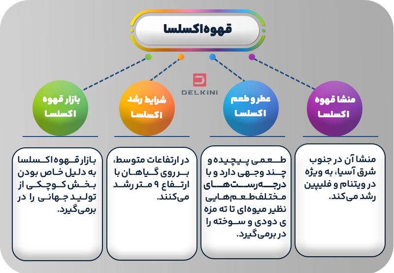 قهوه اکسلسا تاریخچهای نسبتا جدید در دنیای قهوه دارد. این قهوه در ابتدا بهعنوان گونهای جداگانه در نظر گرفته میشد، اما متخصصان حوزه قهوه به دلیل ویژگیهای مشترک بین اکسلسا و لیبریکا، از جمله دانههای بزرگ بادامیشکل و گیاهان بلند، قهوه اکسلسا را در خانواده لیبریکا طبقهبندی کردند. این نژاد قهوه بیشتر در جنوب شرق آسیا بهویژه در ویتنام و فیلیپین رشد میکند و حدود ۷ درصد از تولیدات جهانی قهوه را تشکیل میدهد.