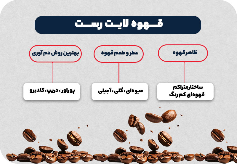 | لایت (روشن) | قهوهای روشن | میوهای، اسیدی | مرکباتی، گلی | بالا | دمکردن دستی، آیس کافی |
