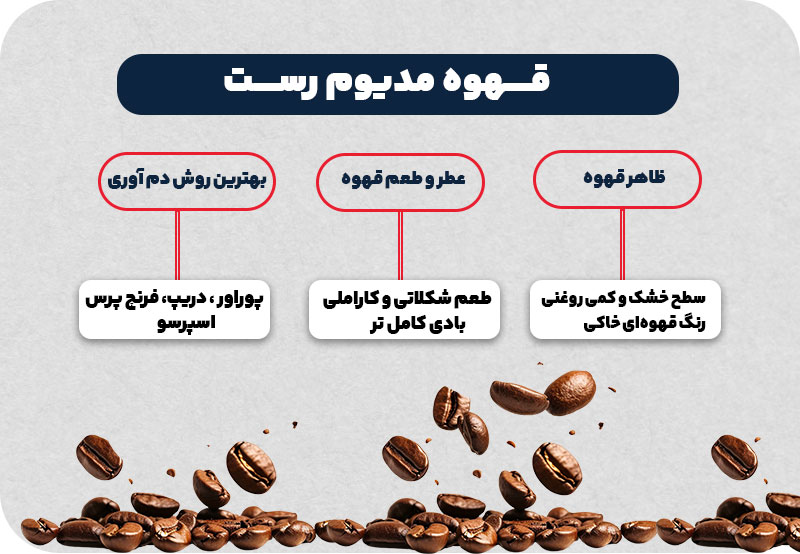 | مدیوم (متوسط) | قهوهای متوسط | کاراملی، شکلاتی | ملایم، متعادل | متوسط | اسپرسو، قهوه دمی |