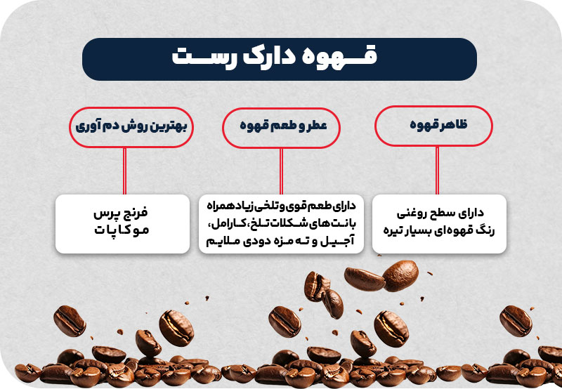 | دارک (تیره) | قهوهای تیره تا سیاه | دودی، اسپایسی | سنگین و تلخ | کم | اسپرسو غلیظ، قهوه دمی |