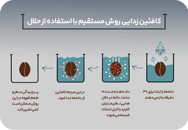 در این روش دانههای قهوه به طور مستقیم در مجاورت با حلالهای شیمیایی قرار میگیرند تا کافئین از دانه جدا شود. به این صورت که دانهها را ابتدا برای ۳۰ دقیقه بخار میدهند تا منافذ آنها باز شده و حلالها راحتتر کافئین را خارج کنند. پس از این پروسه، دانهها به مدت ۱۰ ساعت دائما در حلالهایی نظیر متیلن کلراید یا اتیل استات شسته میشوند تا کافئین از دانهها جدا شود. پیچیدگی عطر و طعم قهوه در این روش ممکن است کمی تغییر کند.