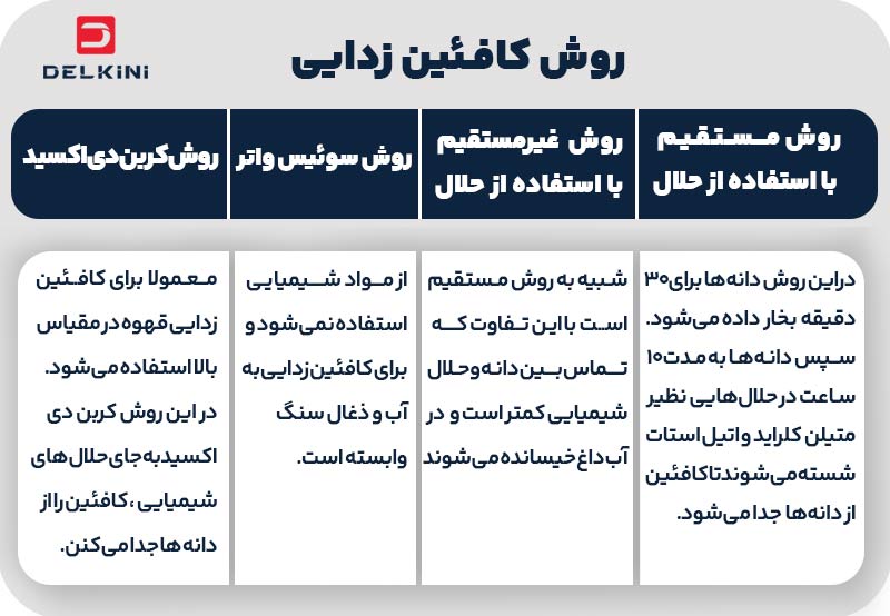 | روشهای کافئینزدایی | روشهای مختلفی برای حذف کافئین از دانههای قهوه وجود دارد، از جمله استفاده از بخار، حلالهای شیمیایی و روشهای طبیعی. هدف این است که کافئین حذف شود در حالی که عطر و طعم قهوه حفظ شود. |