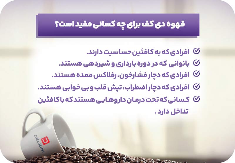 قهوه دیکف راه چارهای برای همه کسانی است که می خواهند بدون درگیر شدن با عوارض کافئین، از عطر و طعم یک فنجان قهوه دلپذیر لذت ببرند. روشهای تولید قهوه دی کف از گذشته تا به حال پیشرفت زیادی داشتهاند تا کافئین بدون تغییر دادن خصوصیات اصلی قهوه از دانه جدا شود. فراموش نکنید که قهوه دی کف واقعا بدون کافئین نیست و درصد بسیار پایینی را شامل میشود. این قهوه برای افراد حساس به کافئین یا دارای بیماری و اختلالات خواب و اضطراب و همچنین خانمهای باردار یا شیرده، میتواند جایگزینی عالی به جای قهوه معمولی باشد.