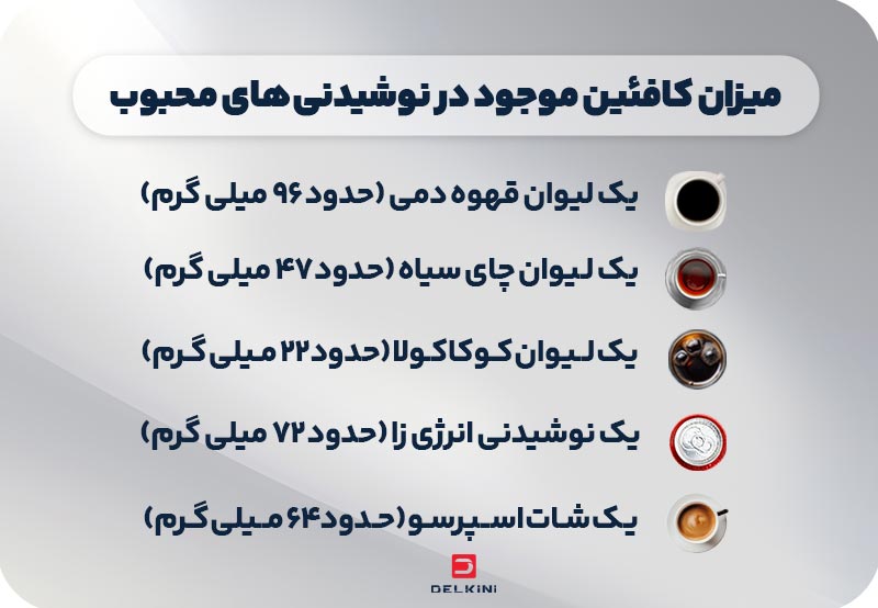 اگر میزان کافئین نوشیدنیهای مورد علاقهتان را بدانید، خیلی راحت میتوانید با حسابکتاب ساده میزان کافئین مصرفی خود را محاسبه کنید. تا وقتی که این میزان از ۴۰۰ میلیگرم در روز عبور نکند، احتمالا دچار مشکلات خاصی نخواهید شد. میزان کافئین موجود در قهوه و دیگر نوشیدنیهای کافئیندار عبارتاند از: