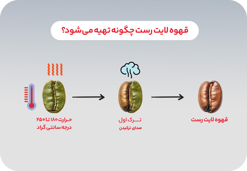 قهوه لایت رست با حرارت دادن دانههای سبز قهوه تا دمایی بین ۱۸۰ تا ۲۰۵ درجه سانتیگراد تهیه میشود. زمان کوتاهتر و دمای پایینتر برشتهکاری باعث میشود ویژگیها و طعمهای ذاتی دانه قهوه حفظ شوند. برخلاف درجههای تیرهتر، درجه لایت روی رسیدن به مرحلهای به نام اولین ترک تمرکز دارد. این مرحله زمانی اتفاق میافتد که گازها از دانهها خارج شده و صدایی شبیه ترکیدن ایجاد کنند. فرایند رست بلافاصله پس از این مرحله متوقف میشود تا دانهها طعم زنده و خاص خود را حفظ کنند. نتیجه این درجه برشتهکاری، قهوهای با اسیدیته زنده و نتهای میوهای یا گُلی است که بسته به منبع و روش فرآوری دانهها میتواند بسیار متفاوت باشد.