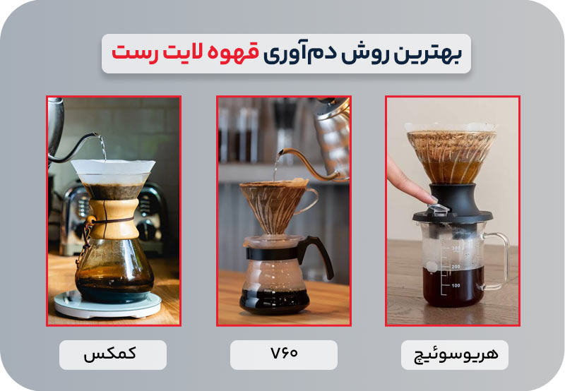 قهوه لایت رست را میتوان با روشهای مختلف دمآوری کرد، اما روشهای قطرهای مانند ابزار پوراور از جمله V60، کمکس یا سوئیچ پیشنهاد میشوند. این دمافزارها امکان کنترل دقیق روی متغیرهایی مانند دمای آب، سرعت جریان و زمان استخراج را فراهم میکنند که برای استخراج طعمهای ظریف و پیچیده قهوه لایت رست ضروری است.