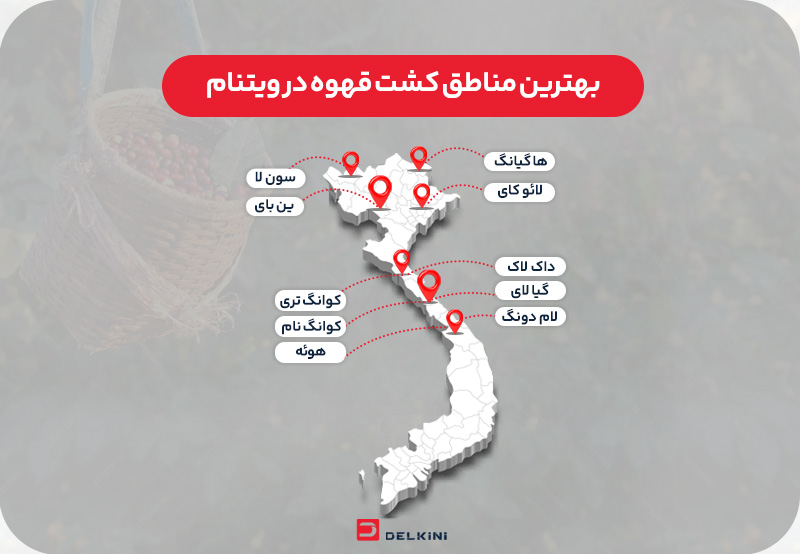 مناطق کشت قهوه در ویتنام در سراسر این کشور پراکنده هستند و هر کدام شرایط و ویژگیهای منحصربهفردی دارند که بر پروفایل طعمی دانهها تأثیر میگذارد. ارتفاعات مرکزی ویتنام به عنوان منطقه اصلی کشت قهوه شناخته میشوند که دلیل آن ارتفاع زیاد و خاک آتشفشانی حاصلخیز این مناطق است. در این مناطق بیشتر روبوستا تولید میشود، هرچند ممکن است کشت برخی از گونههای عربیکا نیز به چشم بخورد. در ادامه، به معرفی مناطق کشت قهوه در ویتنام میپردازیم: