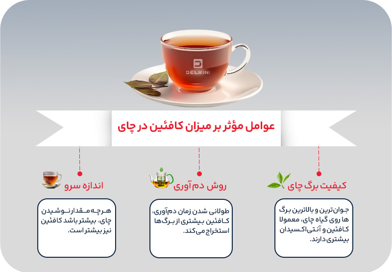 روش دم کردن: هر چقدر زمان دم کشیدن و دمای آب بیشتر باشد، کافئین بیشتری از برگها استخراج میشود.