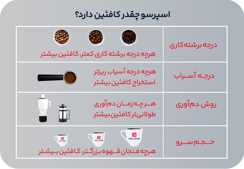 بصورت خلاصه عوامل موثر کافئین اسپرسو در جدول زیر آمده است: