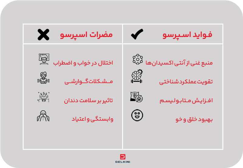 اسپرسو به لطف آنتیاکسیدانها و کافئین فواید بسیاری برای سلامتی دارد، اما لازم است جنبههای منفی مصرف بیش از حد آن را نیز در نظر بگیرید. به طور کلی، اسپرسو یک نوشیدنی کمکالری با فواید سلامتی چشمگیر است، اما مصرف آن باید متعادل باشد. در ادامه به طور خلاصه به فواید و ضررهای اسپرسو میپردازیم.