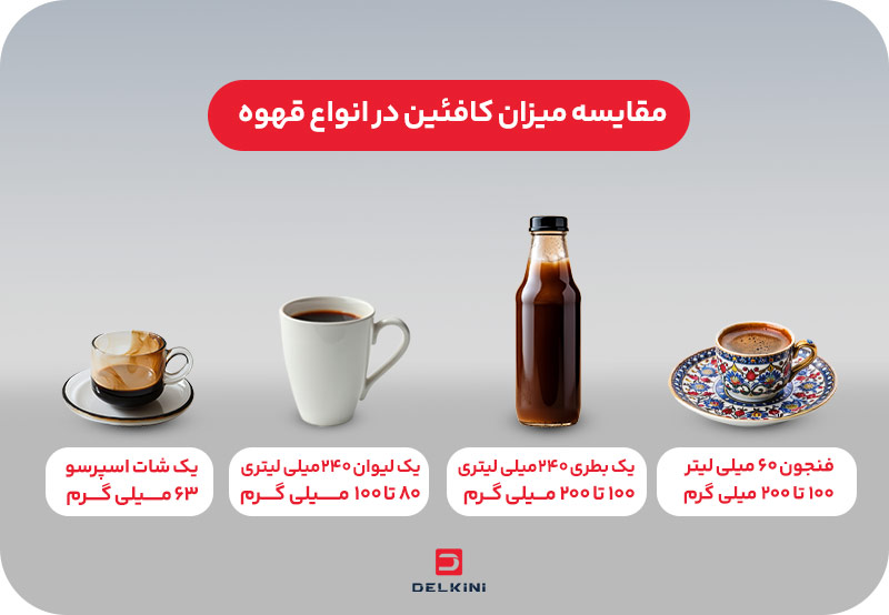 • اسپرسو: یک شات اسپرسو که حدود ۳۰ میلی‌لیتر است، حدود ۶۳ میلی‌گرم کافئین دارد. اگرچه حجم آن کوچک است، غلظت بالای کافئین، انرژی سریعی فراهم می‌کند. نوشیدنی‌های بر پایه اسپرسو نظیر آمریکانو، لاته، موکا و کاپوچینو نیز به اندازه تعداد شات‌های مورد استفاده کافئین دارند. (میزان کافئین قهوه اسپرسو)