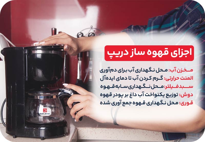 | اجزای اصلی | مخزن آب، سبد فیلتر، دوش، المنت حرارتی و قوری. |
