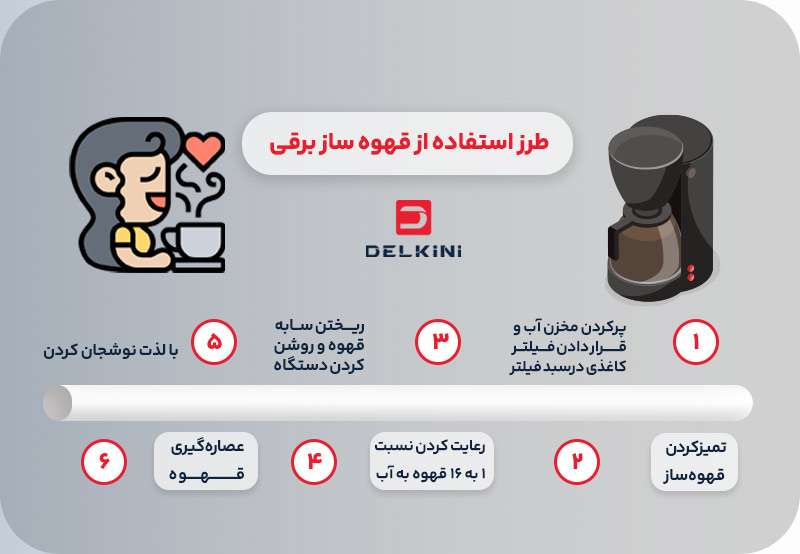 | فرآیند دمآوری | آب در مخزن گرم شده، از طریق دوش روی سابه قهوه ریخته و پس از عبور از آن، قهوه در قوری جمع میشود. |