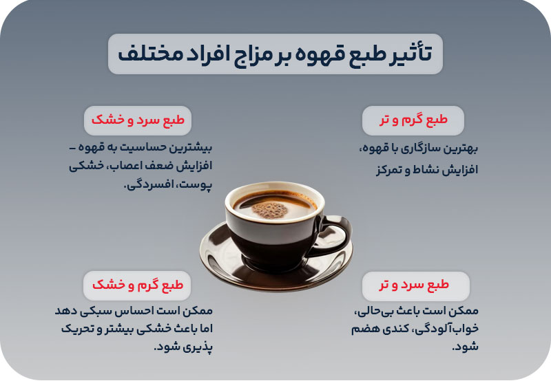 در طب سنتی، بدن انسان به چهار طبع اصلی تقسیم میشود: گرم و تر، گرم و خشک، سرد و تر، سرد و خشک. هر فرد بسته به مزاج غالب خود، واکنش متفاوتی به غذاها و نوشیدنیها نشان میدهد. از این منظر، مصرف قهوه که طبعی سرد و خشک دارد، میتواند در برخی افراد اثرات مثبت و در برخی دیگر واکنشهایی ناخوشایند ایجاد کند. به طور کلی مصرف قهوه باید با شناخت دقیق مزاج فرد و رعایت تعادل صورت گیرد تا هم از خواص آن بهرهمند شد و هم از آسیبهای احتمالی جلوگیری کرد.