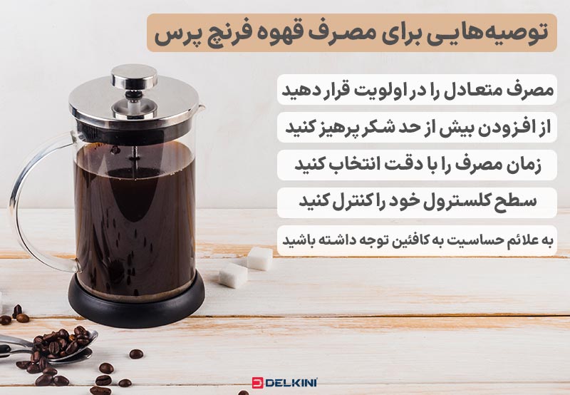 سطح کلسترول خود را کنترل کنید: از آنجایی که قهوه فرنچ پرس فیلتر کاغذی ندارد، ترکیباتی مانند کفستول و کاهوئول در آن باقی میمانند که میتوانند بر سطح چربی خون تأثیر بگذارند. افرادی که کلسترول بالا دارند، بهتر است پیش از مصرف منظم با پزشک مشورت کنند.